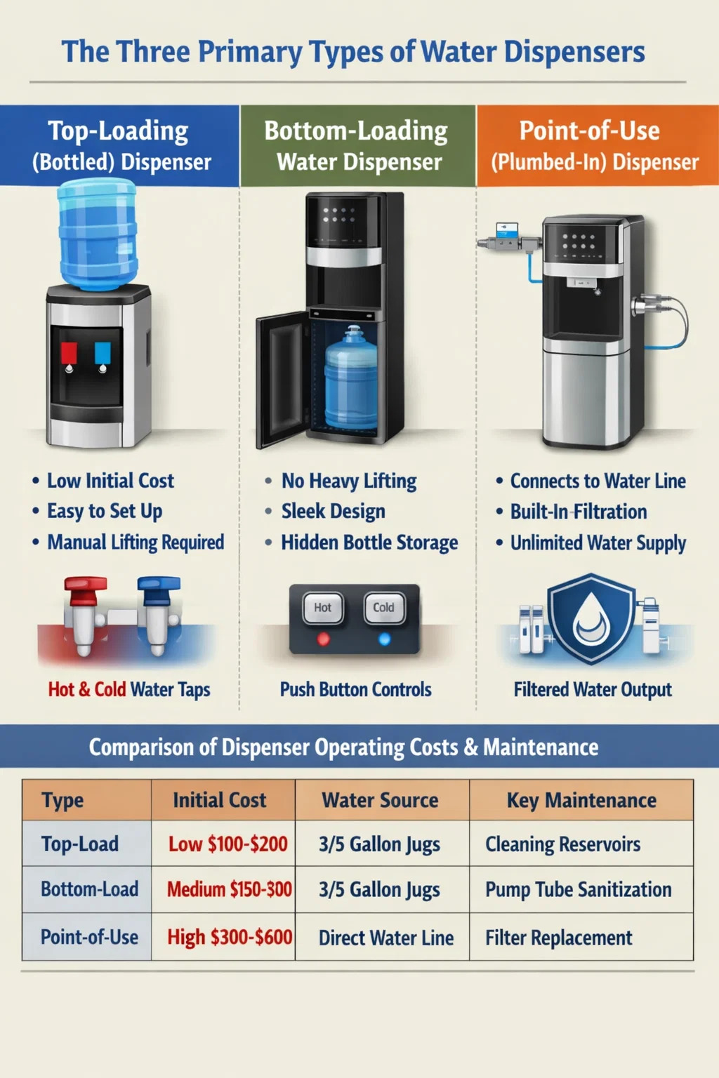 একটি বাড়ি বা অফিসের জন্য হাইড্রেশন সলিউশনের মূল্যায়ন করার সময়, জল সরবরাহকারীকে তাদের লোডিং প্রক্রিয়া এবং জলের উত্সের উপর ভিত্তি করে সাধারণত তিনটি স্বতন্ত্র প্রকারে শ্রেণীবদ্ধ করা হয়: টপ-লোডিং (বোতলজাত) ডিসপেনসার, বটম-লোডিং ডিসপেনসার এবং পয়েন্ট-অফ-ইউজ (প্লাম্বড) ডিসপেনসার। প্রতিটি সিস্টেম একটি নির্দিষ্ট ব্যবহার করে জল বিতরণ কল প্রবাহ পরিচালনা করার জন্য কনফিগারেশন, এবং সঠিকটি বেছে নেওয়া আপনার শারীরিক স্থান, বাজেট এবং পছন্দসই রক্ষণাবেক্ষণ স্তরের উপর নির্ভর করে।