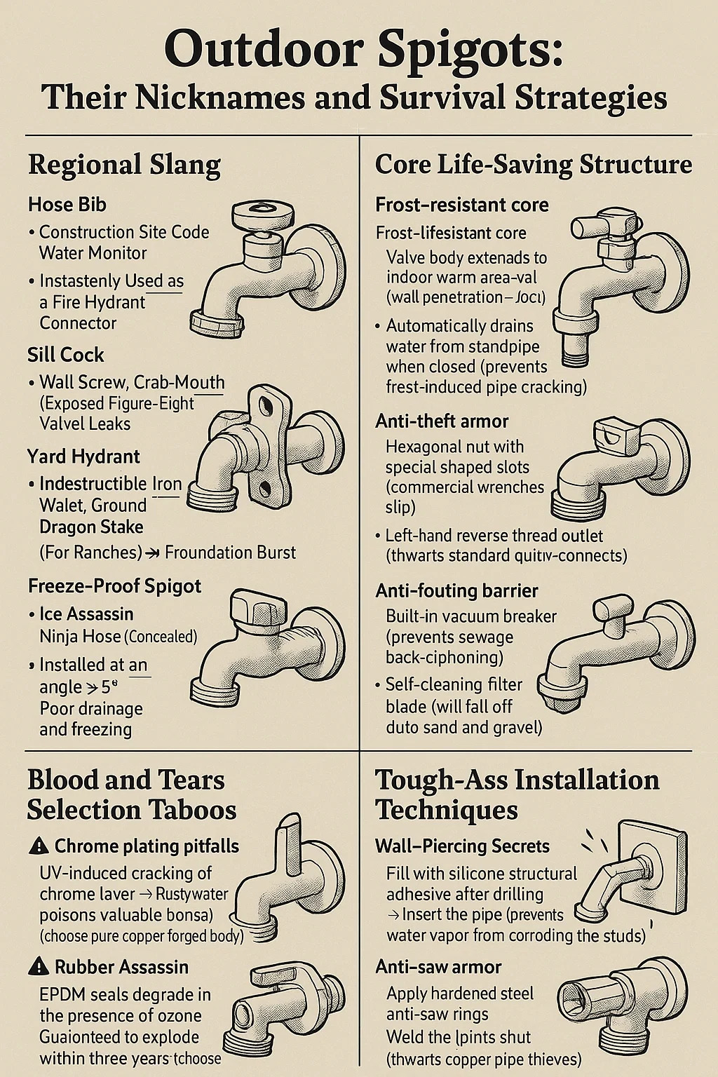 | ইয়ার্ড হাইড্র্যান্ট | ফ্রস্ট-প্রুফ আয়রন গুটস | গোফার স্টিক (খামার বৈশিষ্ট্য) | অনুপস্থিত ড্রেন ভালভ → ফ্রিজ-বার্স্ট ফাউন্ডেশন |
